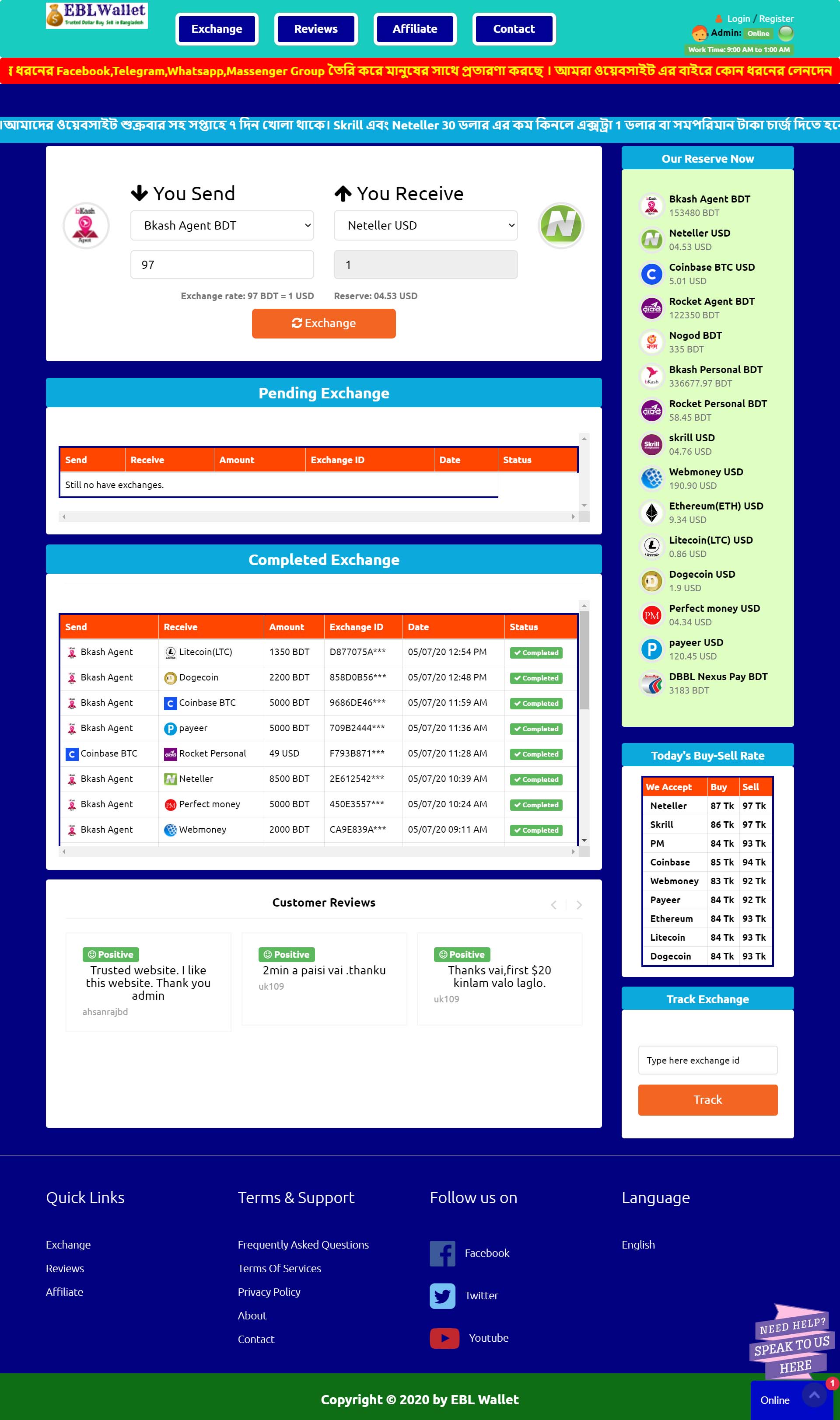 EBLwallet.Com is a full Responsive and Unique Dollar Buy Sell, Exchange and eWallet Website, Here You Can Buy, Sell, Exchange, Stoke, Deposit, Send, Receive, Withdraw your Money. We Completely Design and Customize of EBLwallet.